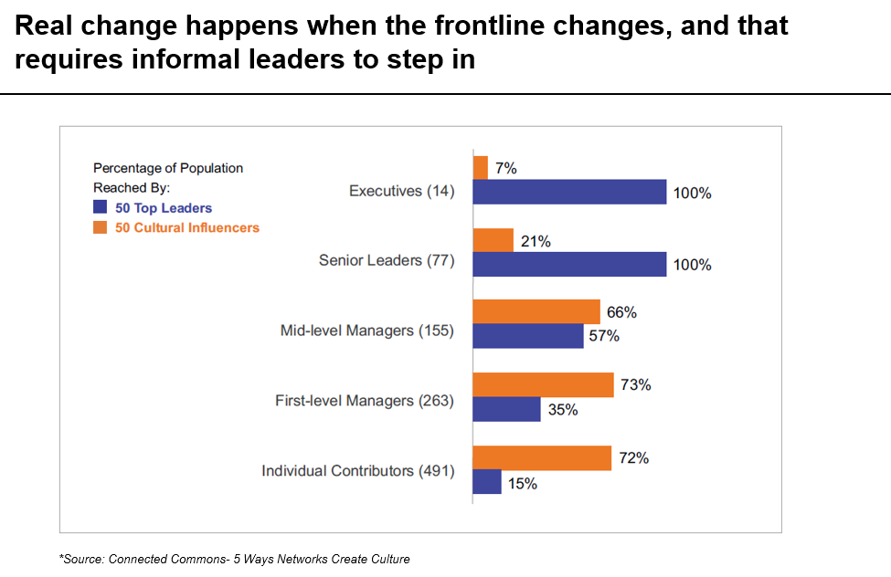 Behaviours of individuals (which are the currency of cultural change) are not typically changed by printing them on the wall, putting them on a PowerPoint or having a CEO list them out in an annual town hall event. People often change behaviours, in an organization, by seeing others, by copying behaviours of their colleagues and peers, especially those they have strong relationships with or admire. This is where the role of influencers and informal leaders (such as the Muckers and Bellini’s of this world) come into play. They are the unsung heroes of cultural change. Unlike formal leaders in top management (which are a few in number) informal leaders’ cross organizational boundaries and come equipped with a high degree of breadth and reach. This allows for more scalable and viral spread of the behaviours targeted. In fact, cultural influencers can have close to 60% more reach than formal leaders have in an organization with frontline staff, who are the real unlockers of change. Informal leaders can often be the true cultural leaders of any organization, thus identifying, leveraging, and engaging them to propel change (although not always at the top of the agenda in a cultural change effort), can often prove to have the most impact.